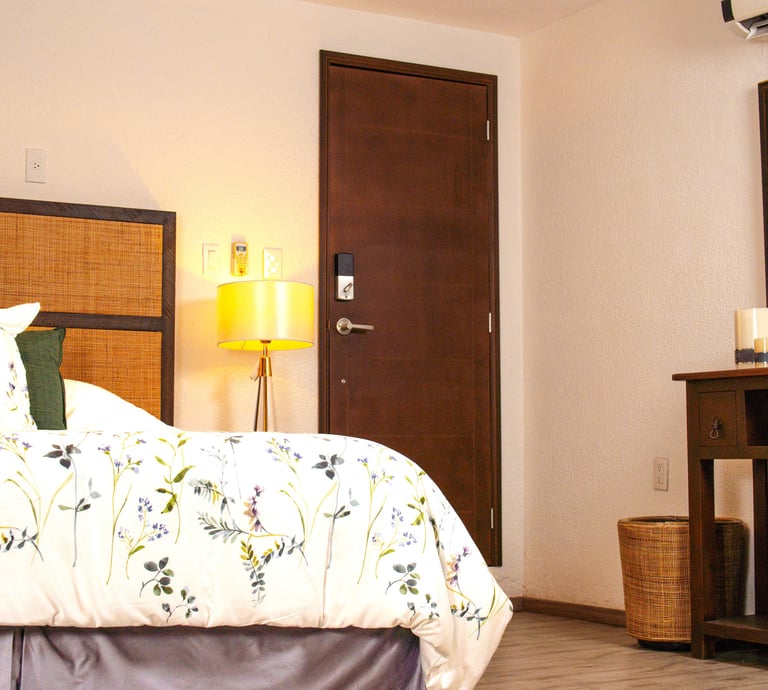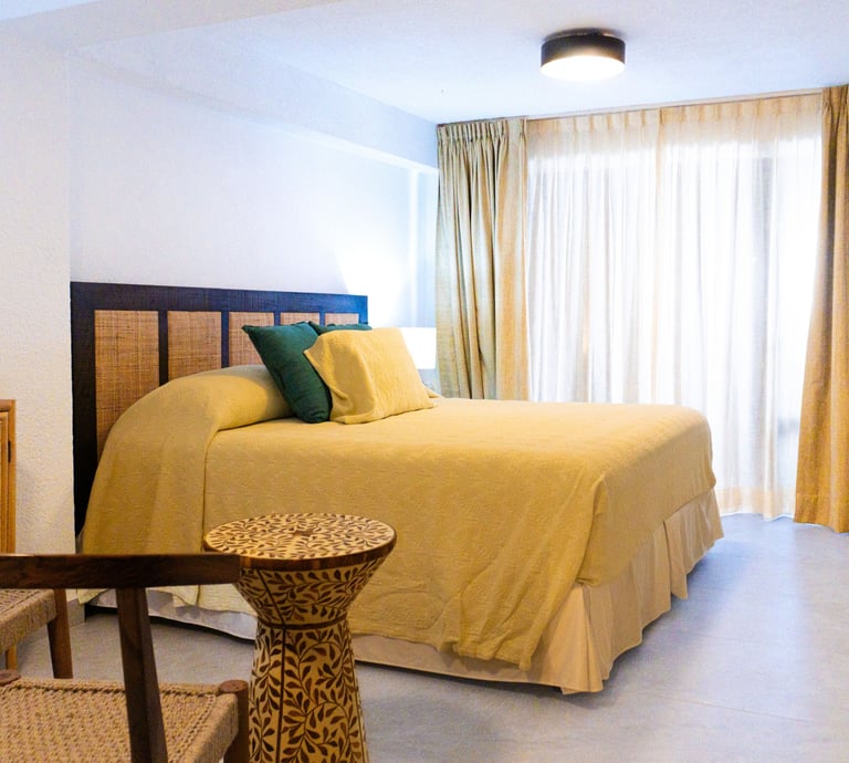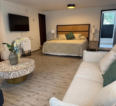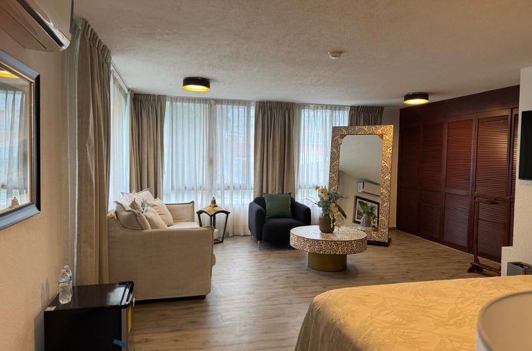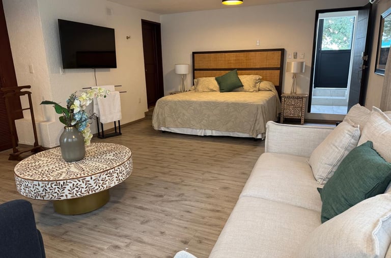 Nuestra Suite Raíz ofrece un refugio acogedor con vistas a la naturaleza, ideal para relajarse y disfrutar de la belleza de Cuautla, Morelos, en un entorno boutique.